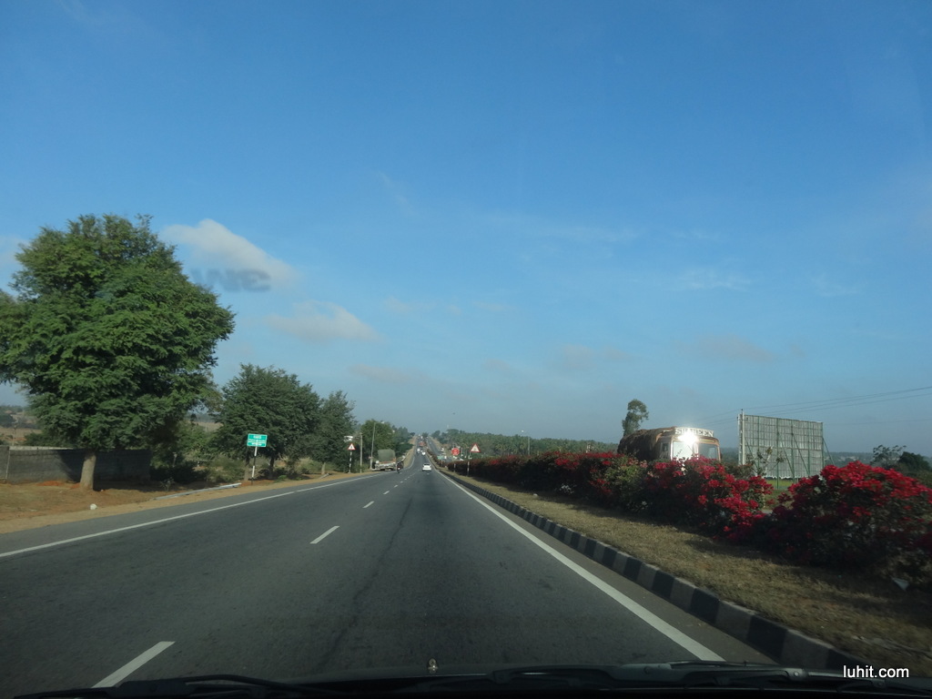 We started at 6 AM, road were clear. When we reached IISC the road was dug up  and had to go through some inside streets. We had Google Maps navigation on the phone, it guided us easily through the diversion. We than took the Neelamangla expressway  headed towards Tumkur. The road was pretty good – four lane high way and easy to maintain decent speed. Once after Tumkur there were multiple flyovers under construction on the highway where the traffic was diverted to the service lane.  All through the highway we came across multiple loaded trucks tumble sideways. In all these years of driving on India highways, never saw so many trucks in that state in a short span of road.